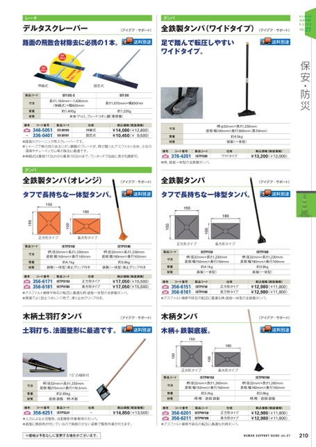 レーキタンパデルタスクレーパー〈アイデア・サポート〉全鉄製タンパ(ワイドタイプ)〈アイデア・サポート〉路面の飛散合材除去に必携の1本。送料別途足で踏んで転圧しやすいワイドタイプ。送料別途HUMANSUPPORTEGVOL.27UID保安・防災寸法質量材質柄:φ32mm×長さ1,230mm底板:幅100mm×奥行300mm(厚さ9mm)約4.5kg鉄製(一体型)備考コード番号376-4201製品コードISTPI300仕様ワイドタイプ税込価格(税抜価格)¥13,200(¥12,000)●柄、底板一体型の全鉄製タンパ。伸縮式固定式製品コードSIT-DS-SSIT-DS寸法質量材質長さ1,100mm〜1,630mm(伸縮式)×幅600mm約1,400g長さ1,670mm×幅600mm約1,220g本体:アルミ、ブレード:リボン鋼(青研磨)備考コード番号346-5051336-0401-製品コードIS130105IS130101仕様伸縮式固定式税込価格(税抜価格)¥14,080(¥12,800)¥10,450(¥9,500)●路面のクリーニング用スクレーパーです。●シャープで弾力性のあるリボン鋼製のブレードが、飛び散ったアスファルト合材、小石の清掃やチューインガム等の除去に最適です。●伸縮式は最短110cmから最長163cmまで、ワンタッチで自由に長さを調節可。タンパ全鉄製タンパ(オレンジ)〈アイデア・サポート〉全鉄製タンパ〈アイデア・サポート〉タフで長持ちな一体型タンパ。送料別途タフで長持ちな一体型タンパ。送料別途正方形タイプ長方形タイプ製品コードISTPO150ISTPO180寸法質量材質柄:径32mm×長さ1,230mm底板:幅150mm×奥行150mm柄:径32mm×長さ1,230mm底板:幅180mm×奥行100mm約4.1kg約3.8kg鉄製(一体型)滑止グリップ付き鉄製(一体型)滑止グリップ付き正方形タイプ長方形タイプ製品コードISTPI150ISTPI180寸法質量材質柄:径32mm×長さ1,230mm底板:幅150mm×奥行150mm柄:径32mm×長さ1,230mm底板:幅180mm×奥行100mm約4.1kg鉄製(一体型)約3.8kg鉄製(一体型)備考コード番号356-6171356-6181製品コードISTPO150ISTPO180仕様正方形タイプ長方形タイプ税込価格(税抜価格)¥17,050(¥15,500)¥17,050(¥15,500)●アスファルト補修や砕石の転圧に最適な柄・底板一体型の全鉄製タンパ。●現場でよく目立つオレンジ色で、滑り止めグリップ付き。備考コード番号356-6151356-6161製品コードISTPI150ISTPI180仕様正方形タイプ長方形タイプ税込価格(税抜価格)¥12,980(¥11,800)¥12,980(¥11,800)●アスファルト補修や砕石の転圧に最適な柄・底板一体型の全鉄製タンパ。木柄土羽打タンパ〈アイデア・サポート〉土羽打ち、法面整形に最適です。送料別途木柄タンパ木柄+鉄製底板。〈アイデア・サポート〉送料別途15°の傾斜付寸法質量材質柄:径32mm×長さ1,230mm底板:幅270mm×奥行176.5mm約2.65kg底板:鉄製/柄:木製正方形タイプ長方形タイプ製品コードISTPW150ISTPW180寸法質量材質柄:径32mm×長さ1,260mm底板:幅150mm×奥行150mm柄:径32mm×長さ1,260mm底板:幅180mm×奥行100mm約3.2kg柄:樫/底板:鉄製約2.8kg柄:樫/底板:鉄製備考コード番号356-6251製品コードISTPSL01仕様ー税込価格(税抜価格)¥14,850(¥13,500)●人力による土羽整形、法面整形作業専用のタンパ。●底面に傾斜角が付いているので負担の少ない姿勢で整形作業が行えます。※価格は予告なしに変更する場合がございます。備考コード番号356-6201356-6211製品コードISTPW150ISTPW180仕様正方形タイプ長方形タイプ税込価格(税抜価格)¥12,980(¥11,800)¥12,980(¥11,800)●アスファルト補修や砕石の転圧に最適な木柄タンパ。HUMANSUPPORTGUIDEvol.27210