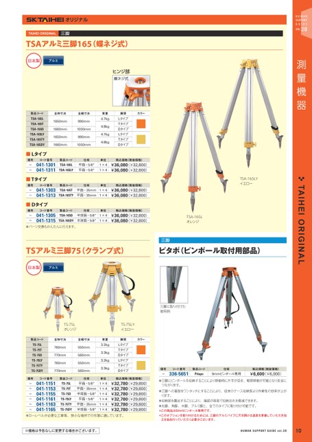※価格は予告なしに変更する場合がございます。TAIHEIORIGINAL三脚TSAアルミ三脚165(蝶ネジ式)日本製アルミヒンジ部蝶ネジ式カラー全伸寸法全縮寸法1650mm990mm1660mm1000mm1650mm990mm1660mm1000mm質量4.7kg4.8kg4.7kg4.8kg脚頭LタイプTタイプDタイプLタイプTタイプDタイプ製品コードTSA-165LTSA-165TTSA-165DTSA-165LYTSA-165TYTSA-165DY■Lタイプ備考コード番号--041-1301041-1311製品コードTSA-165LTSA-165LY仕様平面・5/8″平面・5/8″単位1×41×4税込価格(税抜価格)¥36,080(¥32,800)¥36,080(¥32,800)■Tタイプ備考コード番号--041-1303041-1313製品コードTSA-165TTSA-165TY仕様平面・35mm平面・35mm単位1×41×4税込価格(税抜価格)¥36,080(¥32,800)¥36,080(¥32,800)■Dタイプ備考コード番号--041-1305041-1315製品コードTSA-165DTSA-165DY仕様単位半球面・5/8″1×4半球面・5/8″1×4税込価格(税抜価格)¥36,080(¥32,800)¥36,080(¥32,800)●パーツ交換もかんたんに行えます。TSA-165LYイエローTSA-165Lオレンジ三脚TSアルミ三脚75(クランプ式)ピタポ(ピンポール取付用部品)日本製アルミ三脚に取り付けた使用例TS-75Lオレンジ製品コード全伸寸法全縮寸法TS-75LTS-75TTS-75DTS-75LYTS-75TYTS-75DY760mm770mm760mm770mm550mm560mm550mm560mm質量3.2kg3.3kg3.2kg3.3kgカラーTS-75LYイエロー脚頭LタイプTタイプDタイプLタイプTタイプDタイプ備考コード番号製品コード------041-1151041-1153041-1155041-1161041-1163041-1165TS-75LTS-75TTS-75DTS-75LYTS-75TYTS-75DY仕様単位1×4平面・5/8″平面・35mm1×4半球面・5/8″1×41×4平面・5/8″1×4平面・35mm半球面・5/8″1×4税込価格(税抜価格)¥32,780(¥29,800)¥32,780(¥29,800)¥32,780(¥29,800)¥32,780(¥29,800)¥32,780(¥29,800)¥32,780(¥29,800)●ローレベルが必要な工事等、狭小な場所での作業に適しています。備考-コード番号製品コード仕様336-5651Pitapo9mmピンポール専用税込価格(税抜価格)¥6,600(¥6,000)●三脚にピンポールを収納することにより移動時に片手が空き、軽装移動が可能となり安全につながります。●三脚への着脱をワンタッチにすることにより、従来のケース収納型より作業性の効率が上がります。●収納部を露出することにより、確認が容易で収納忘れを軽減できます。●丸脚、角脚、木脚、アルミ脚と、全てのタイプに取り付け可能です。*この商品は9mmピンポール専用です。*このオプションを取り付けるためには、三脚のアルミパイプに穴を開ける道具を準備していただき加工を各自行っていただく必要がございます。10