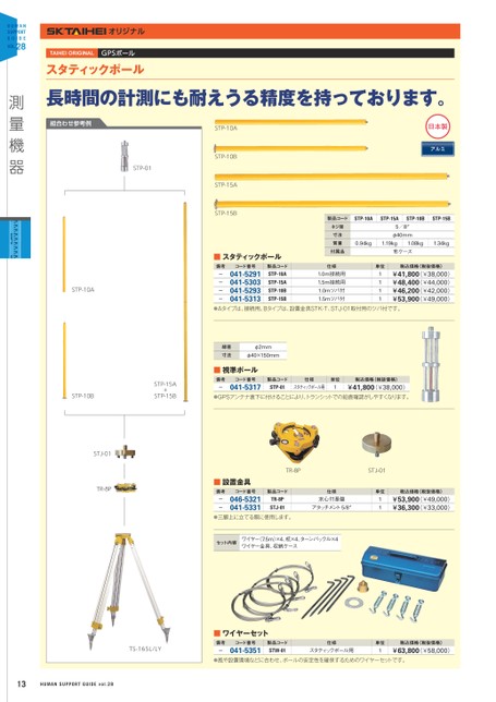 オリジナルTAIHEIORIGINALGPSポールスタティックポール長時間の計測にも耐えうる精度を持っております。組合わせ参考例STP-01STP-10ASTP-10BSTJ-01TR-8PSTP-15ASTP-15B+STP-10ASTP-10BSTP-15ASTP-15B■スタティックポール備考コード番号----041-5291041-5303041-5293041-5313製品コードSTP-10ASTP-15ASTP-10BSTP-15B日本製アルミ製品コードSTP-10ASTP-15ASTP-10BSTP-15Bネジ径寸法質量付属品仕様1.0m接続用1.5m接続用1.0mツバ付1.5mツバ付5/8″φ40mm0.94kg1.19kg1.08kg1.34kg布ケース単位税込価格(税抜価格)1111¥41,800(¥38,000)¥48,400(¥44,000)¥46,200(¥42,000)¥53,900(¥49,000)●Aタイプは、接続用。Bタイプは、設置金具STK-T、STJ-01取付用のツバ付です。線径寸法φ2mmφ40×150mm■視準ポール備考コード番号製品コード仕様単位税込価格(税抜価格)-041-5317¥41,800(¥38,000)●GPSアンテナ直下に付けることにより、トランシットでの鉛直確認がしやすくなります。STP-01スタティックポール用1TR-8PSTJ-01■設置金具備考コード番号製品コード--046-5321041-5331TR-8PSTJ-01●三脚上に立てる際に使用します。仕様求心付基盤アタッチメント5/8″単位税込価格(税抜価格)11¥53,900(¥49,000)¥36,300(¥33,000)セット内容ワイヤー(7.5m)×4、杭×4、ターンバックル×4ワイヤー金具、収納ケースTS-165L/LY■ワイヤーセット備考-コード番号041-5351製品コードSTW-01仕様スタティックポール用単位1税込価格(税抜価格)¥63,800(¥58,000)●風や設置環境などに合わせ、ポールの安定性を確保するためのワイヤーセットです。13
