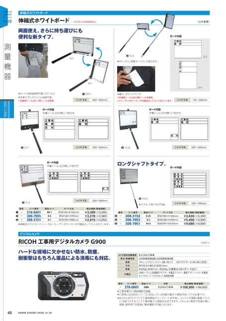 伸縮式ホワイトボード伸縮式ホワイトボード*マグネットは付きません。両面使え、さらに持ち運びにも便利な新タイプ。ヨコ❷D-0●タテ、ヨコ、両面ボードとして使えます。ボード内容〈土牛産業〉ヨコタテ●ボードは両面使用可能(タテ・ヨコ)●作業ズボンポケットに収納可能*交換用シールはD-1用シールを使用。タテ❶RD-1シャフト寸法200〜550mm●最小、ポケットサイズ!*交換用シールはD-0用シールを使用。*イレーザー付マーカーが付属品としてセットされています。シャフト寸法110〜350mmボード内容予備シール(日付無し)1枚付きボード内容予備シール(日付無し)1枚付き❸D-1シャフト寸法200〜550mm❹D-2Cシャフト寸法200〜550mmボード内容予備シール(日付無し)1枚付きロングシャフトタイプ。ボード内容❻A4-S●マグネット取り付け可能。シャフト寸法150〜700mm税込価格(税抜価格)¥3,630(¥3,300)¥5,456(¥4,960)¥9,680(¥8,800)D-2CD-3A4-S約W166×H129mm約W248×H169mm約W297×H210mm306-3153306-7953306-7951---❹❺❻備考コード番号製品コードボード寸法❺D-3シャフト寸法200〜550mm税込価格(税抜価格)¥3,399(¥3,090)¥3,278(¥2,980)¥2,915(¥2,650)RD-1D-0D-1約W140×H100mm約W120×H70mm約W140×H96mm316-8401306-7955306-3151---❶❷❸備考コード番号製品コードボード寸法●伸縮式ホワイトボードシリーズは、イレーザー付マーカーが付属品としてセットされています。デジタルカメラRICOH工事用デジタルカメラG900ハードな現場に欠かせない防水、防塵、耐衝撃はもちろん薬品による消毒にも対応。45〈リコー〉カメラ部有効画素数防水/防塵性能電源寸法質量付属品約2,000万画素JIS保護等級8級/JIS保護等級6級リチャージブルバッテリーDB-110×1ACアダプターK-AC166J(別売)W118.2×H65.5×D33.1mm約225g(本体のみ)、約252g(付属電池・SDメモリーを含む)USBケーブル、USB電源アダプター、充電式バッテリー、電源プラグ、バッテリー充電器、ネックストラップ、マクロスタンド、使用説明書備考-コード番号製品コード376-0601G900仕様約2000万画素税込価格(税抜価格)¥108,900(¥99,000)●工事用電子小黒板機能を搭載。●ご使用にはG900シリーズに対応している市販の電子小黒板作成ソフトが必要です。●あらかじめPCアプリで工事用黒板のテンプレートを作成し、カメラメモ情報(画像・テキスト)を紐づけすることで工事用電子小黒板を生成できます。これにより高所や足場の悪い現場、暗所等でも容易に黒板撮影が可能になります。