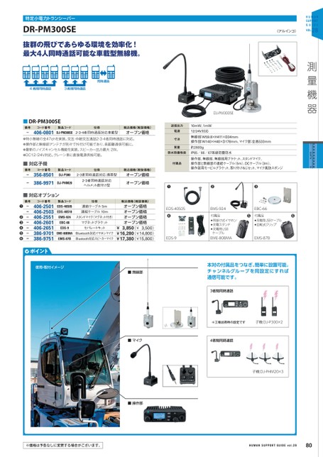オープン価格オープン価格オープン価格オープン価格3,850(¥¥3,500)¥16,280(¥14,800)¥17,380(¥15,800)EDS-40S05❹EDS-9EMS-924付属品●耳掛け式イヤホン●充電スタンド●充電用USBケーブルEME-80BMAEBC-66❺付属品●充電用USBケーブル●回転式クリップ❻EMS-87BHUMANSUPPORTEGVOL.28DUI測量機器特定小電力トランシーバーDR-PM300SE抜群の飛びであらゆる環境を効率化!最大4人同時通話可能な車載型無線機。4者間同時通話3者間同時通話同時通話〈アルインコ〉■DR-PM300SE備考ーコード番号406-0801製品コード仕様DJ-PM300SE・・324者同時通話対応車載型税込価格(税抜価格)オープン価格●特小無線の全47chを実装。交互・中継交互通話2・3・4者同時通話に対応。●操作部と無線部アンテナが別々で外付け可能であり、長距離通信可能に。●最新のノイズキャンセル機能を実装。スピーカー出力最大2W。●DC12/24V対応。クレーン車に直接電源供給可能。■対応子機備考ーーコード番号356-8501製品コードDJ-P300386-9971DJ-PHM20仕様・23者同時通話対応携帯型3者同時通話対応・2ヘルメット直付け型税込価格(税抜価格)オープン価格オープン価格■対応オプションDJ-PM300SE送信出力電源寸法質量防水防塵性能付属品10mW、1mW12/24V対応無線部:W59.8×H411×D34mm操作部:W140×H40×D178mm、マイク部:全高533mm約2600gIP65/66/67等級防塵防水操作部、無線部、無線部用ブラケット、スタンドマイク、操作部と無線部の連結ケーブル(5m)、DCケーブル(3m)、操作部用モービルブラケット、取り付けねじセット、マイク風防スポンジ❶❷❸仕様税込価格(税抜価格)製品コードEDS-40S05EDS-40S10EMS-924EBC-66EDS-9連結ケーブル5m連結ケーブル10mスタンドマイク(マグネット付き)マグネットブラケットセパレートキットEME-80BMAEMS-87BBluetooth対応イヤホンマイクBluetooth対応スピーカーマイクコード番号406-2501406-2503406-2551406-2601406-2651386-9701386-9751備考ーーーーーーー❶❷❸❹❺❻ポイント使用・取付イメージ■無線部本対の付属品をつなぎ、簡単に設置可能。チャンネルグループを同設定にすれば通信可能です。3者間同時通話※工場出荷時の設定です子機:DJ-P300×2■マイク4者間同時通話子機:DJ-PHM20×3■操作部※価格は予告なしに変更する場合がございます。HUMANSUPPORTGUIDEvol.2880