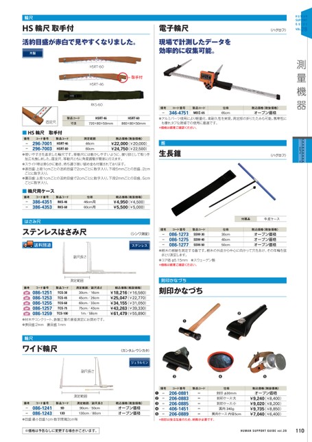 輪尺HS輪尺取手付活約目盛が赤白で見やすくなりました。木製電子輪尺現場で計測したデータを効率的に収集可能。〈ハグロフ〉HUMANSUPPORTEGVOL.28UDI測量機器備考-コード番号346-4751製品コードMDⅡ-65仕様65cm税込価格(税抜価格)オープン価格●アルミパーツ使用により軽量化、高耐久性を実現。測定部の折りたたみも可能。携帯性にも優れタフな現場での使用に最適です。*価格は都度ご確認ください。〈ハグロフ〉長錐錐生取手付HSRT-60HSRT-46RKS-60固定尺製品コード寸法HSRT-46HSRT-60720×80×50mm860×80×50mm■HS輪尺取手付備考コード番号測定範囲税込価格(税抜価格)製品コードHSRT-46HSRT-60--296-7001296-7003¥22,000(¥20,000)¥24,750(¥22,500)●使いやすさを追求した輪尺です。移動尺には動かしやすいように、握り部として取っ手46cm60cm加工を施しました。固定尺、移動尺ともに角度調整が簡単に行えます。●スライド時は滑らかに動き、持ち運び易い留め金も付属されております。●表目盛:上段1cmごとの活約目盛で2cmごとに数字入り。下段5mmごとの目盛、2cmごとに数字入り。●裏目盛:上段1cmごとの活約目盛で2cmごとに数字入り。下段2mmごとの目盛、5cmごとに数字入り。■輪尺用ケース備考--コード番号386-4351386-4353製品コードRKS-46RKS-60仕様46cm用60cm用税込価格(税抜価格)¥4,950(¥4,500)¥5,500(¥5,000)はさみ尺ステンレスはさみ尺送料別途副尺長さ測定範囲〈シンワ測定〉ステンレス備考---コード番号086-1273086-1275086-1277製品コードSSW-30SSW-40SSW-50仕様30cm40cm50cm付属品牛皮ケース税込価格(税抜価格)オープン価格オープン価格オープン価格●樹木の樹齢を測定する錐です。樹木の外皮から中心に向かって穴をあけ、その年輪を抜きとり測定します。●コア径:φ5.15mm●スウェーデン製*価格は都度ご確認ください。HUMANSUPPORTGUIDEvol.28110❸❹❺税込価格(税抜価格)オープン価格¥9,240(¥8,400)¥9,020(¥8,200)¥9,735(¥8,850)¥7,040(¥6,400)仕様刻印φ30mm刻印ケース:大刻印ケース:小黒肉340g黒肉ケース内径5cm製品コードーーーーーコード番号206-0881206-0883206-0885406-1451206-0889備考-----❶❷❸❹❺*刻印は受注生産のため、納期が必要です。刻印かなづち刻印かなづち❶❷備考コード番号086-1251086-1253086-1255086-1257086-1259製品コード測定範囲/副尺長さTCS-30TCS-45TCS-60TCS-75TCS-10030cm/16cm45cm/26cm60cm/33cm75cm/43cm1m/58cm税込価格(税抜価格)¥18,216(¥16,560)¥25,047(¥22,770)¥34,155(¥31,050)¥43,263(¥39,330)¥61,479(¥55,890)●材木やコンクリート、鉄製工管の直径測定にお奨めです。●表目盛:2mm裏目盛:1mm輪尺ワイド輪尺〈カンタム・ウシカタ〉ジュラルミン副尺長さ測定範囲備考--コード番号086-1241086-1243製品コード測定範囲/副尺長さ税込価格(税抜価格)9D13D90cm/50cm130cm/80cmオープン価格オープン価格●目盛:最小目盛1cm・数字間隔2cm毎※価格は予告なしに変更する場合がございます。