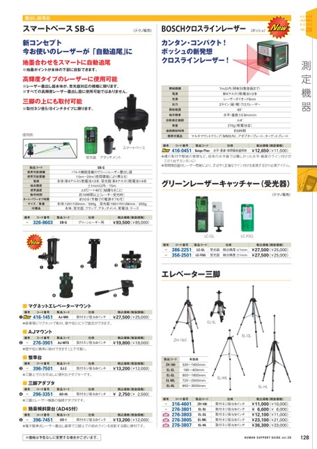※価格は予告なしに変更する場合がございます。墨出し器用品スマートベースSB-G新コンセプト今お使いのレーザーが「自動追尾」に地墨合わせをスマートに自動追尾〈テクノ販売〉BOSCHクロスラインレーザーカンタン・コンパクト!ボッシュの新発想クロスラインレーザー!〈ボッシュ〉※地墨ポイントが本体の下部に投影できます。高輝度タイプのレーザーに使用可能※レーザー墨出し器本体が、受光器対応の機種に限ります。※すべての高輝度レーザー墨出し器に使用可能ではありません。三脚の上にも取付可能※取付ネジ径5/8インチタイプに限ります。使用例製品コード使用可能機種使用可能距離電源検出精度使用温度動作時間オートパワーオフ時間サイズ/質量付属品スマートベース受光器アタッチメントSB-Gパルス機能搭載のグリーンレーザー墨出し器1.5m〜20m(使用環境により異なる)本体:単4アルカリ乾電池×3本、受光器:単4アルカリ乾電池×4本±1mm以内/15m±0℃〜+40℃(結露なきこと)約15時間以上(レーザー受光時)約10分(手動での電源オフも可)本体:120×120mm/550g受光器:150×70×28mm/200g本体、受光器、クランプ、アタッチメント、乾電池、ケース備考-コード番号製品コード326-8603SB-G仕様グリーンレーザー用税込価格(税抜価格)¥93,500(¥85,000)❶❷❹■マグネットエレベーターマウント❸❺❶Nコード番号備考416-1451●鉄骨等にマグネットで取付、壁や柱にビスで固定ができます。取付ネジ径:5/8インチ製品コードAJ-MH仕様税込価格(税抜価格)¥27,500(¥25,000)照射距離電源光源出力照射範囲指示精度自動補正範囲質量連続照射時間標準付属品7m以内(照射対象壁面まで)単4アルカリ乾電池×2本レーザーダイオード6nm2ライン(縦・横)クロスレーザー60°水平・垂直±0.8mm/m±4°270g(乾電池含)約5時間マルチマウントクリップ(MM2/N)、アダプタープレート、ターゲットプレートコード番号備考¥12,650(¥11,500)N416-0451●棚の取付や壁紙の張替など、従来の水平器では難しかった水平・垂直のライン付けが水平・垂直・等間隔目盛照射製品コードQuigoPlus税込価格(税抜価格)仕様この1台でカンタンに!●等間隔目盛付レーザー照射により、すばやく正確なライン付けを実現するDIY必須アイテム。グリーンレーザーキャッチャー(受光器)〈テクノ販売〉LC-GLLC-FSG備考コード番号製品コード仕様--386-2251356-2501LC-GLLC-FSG受光器検出精度:±1mm受光器検出精度:±1mm税込価格(税抜価格)¥27,500(¥25,000)¥27,500(¥25,000)エレベーター三脚■AJマウント備考-❷コード番号276-3901製品コードAJ-MTS仕様取付ネジ径:5/8インチ税込価格(税抜価格)¥19,800(¥18,000)ZH-160EL-SLEL-GL●壁や柱に簡単に取付できます(上下可動)。■整準台備考-❸コード番号製品コード仕様396-7501SJ-2取付ネジ径:5/8インチ税込価格(税抜価格)¥13,200(¥12,000)●三脚上での水平出しに便利なアダプターです。■三脚アダプタ備考-❹コード番号製品コード仕様296-3351AD-45取付ネジ径:5/8インチ税込価格(税抜価格)2,750(¥2,500)¥●三脚とレーザー機器の接続アダプタです。■簡易傾斜雲台(AD45付)備考-❺コード番号製品コード仕様396-7451UD-1取付ネジ径:5/8インチ税込価格(税抜価格)¥13,200(¥12,000)●電子整準式レーザー墨出し器等で三脚上での斜めラインを投影する際に便利です。製品コード有効高ZH-160EL-SLEL-GLEL-MLEL-HL530〜1600mm180〜400mm600〜1600mm720〜2000mm900〜3000mmEL-MLEL-HL備考コード番号--316-4601276-3801u276-3803u276-3805u276-3807製品コード仕様ZH-160EL-SLEL-GLEL-MLEL-HL取付ネジ径:5/8インチ取付ネジ径:5/8インチ取付ネジ径:5/8インチ取付ネジ径:5/8インチ取付ネジ径:5/8インチ税込価格(税抜価格)6,600(¥¥11,000(¥10,000)¥6,000)¥12,100(¥11,000)¥23,100(¥21,000)¥36,300(¥33,000)128