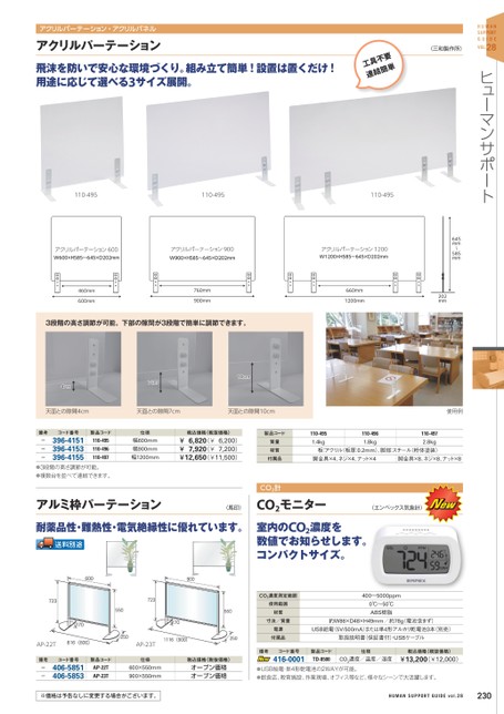 ※価格は予告なしに変更する場合がございます。アクリルパーテーション ・ アクリルパネルアクリルパーテーション飛沫を防いで安心な環境づくり。組み立て簡単!設置は置くだけ!用途に応じて選べる3サイズ展開。〈三和製作所〉要不具工単簡結連110-495110-495110-4953段階の高さ調節が可能。下部の隙間が3段階で簡単に調節できます。天面との隙間4cm天面との隙間7cm天面との隙間10cm使用例備考コード番号製品コード---396-4151396-4153396-4155110-495110-496110-497●3段階の高さ調節が可能。●複数台を並べて連結できます。仕様幅600mm幅900mm幅1200mm税込価格(税抜価格)6,820(¥7,920(¥¥6,200)¥7,200)¥12,650(¥11,500)製品コード質量材質付属品CO2計110-4951.4kg110-4961.8kg110-4972.8kg板:アクリル(板厚:0.2mm)、脚部:スチール(粉体塗装)脚金具×4、ネジ×4、ナット×4脚金具×8、ネジ×8、ナット×8アルミ枠パーテーション〈馬印〉耐薬品性・難熱性・電気絶縁性に優れています。送料別途〈エンペックス気象計〉CO2モニター室内のCO2濃度を数値でお知らせします。コンパクトサイズ。AP-22T備考コード番号製品コード--406-5851406-5853AP-22TAP-23TAP-23T仕様600×550mm900×550mm税込価格(税抜価格)オープン価格オープン価格CO2濃度測定範囲使用範囲材質寸法/質量電源付属品400〜5000ppm0℃〜50℃ABS樹脂約W86×D48×H49mm/約78g(電池含まず)USB給電(5V/500mA)または単4形アルカリ乾電池3本(別売)取扱説明書(保証書付)・USBケーブルコード番号N仕様備考416-0001●USB給電・単4形乾電池の2WAYが可能。●飲食店、教育施設、作業現場、オフィス等など、様々なシーンで大活躍します。CO2濃度/温度/湿度製品コードTD-8500税込価格(税抜価格)¥13,200(¥12,000)230