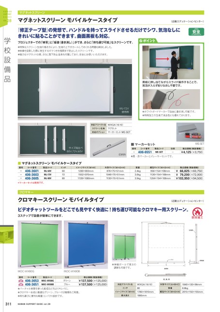 学校設備品HUMANSUPPORTGUIDEvol.28HUMANSUPPORTGUIDEVOL.28マグネットスクリーンマグネットスクリーンモバイルケースタイプ『修正テープ型』の発想で、ハンドルを持ってスライドさせるだけでシワ、気泡なしに〈近畿エデュケーションセンター〉きれいに貼ることができます。曲面黒板も対応。プロジェクターでの「映写」と「板書(書き消し)」ができ、さらに「持ち運び可能」なスクリーンです。●特殊なスクリーン生地の巻き方により、生地の上下がカールしてめくれる問題も解決しました。●映像を投影した際に発生するギラつきを極限まで防止したスクリーンです。●強力なマグネット仕様、さらに落下防止金具も付属しており、安全にお使いいただけます。ポイント黒板に押し当てながらスライド操作することで、気泡が入らず貼りなおし不要です。MJ-72V使用例●ホワイトボードマーカーで自由に書き消し可能です。●特殊加工の生地で消去性にも優れております。対応アスペクト比スクリーン生地対応オプションWXGA(16:10)マグネットマーカーセットME-SETサイズ見比べ80V,72V,60V■マーカーセットME-SET備考-コード番号406-6551製品コードME-SET仕様-税込価格(税抜価格)¥4,125(¥3,750)●黒・赤マーカーとイレーサーセットです。収納時■マグネットスクリーンモバイルケースタイプ備考コード番号製品コードインチイメージサイズ(W×H)外形サイズ(W×D×H)---406-3601406-3603406-3605MJ-60VMJ-72VMJ-80V*マーカーセットは別売です。クロマキー6072801280×800mm1552×970mm1728×1080mm876×75×51mm1046×75×51mm1130×75×51mm質量2.4kg3.0kg3.5kg梱包サイズ(W×D×H)956×154×108mm1126×154×108mm1204×154×108mm税込価格(税抜価格)¥66,825(¥60,750)¥79,200(¥72,000)¥103,950(¥94,500)クロマキースクリーンモバイルタイプビデオチャットツールをどこでも見やすく快適に!持ち運び可能なクロマキー用スクリーン。〈近畿エデュケーションセンター〉3ステップで設置が簡単にできます。●伸縮ポールで高さの調節も可能です。税込価格(税抜価格)MOC-WX80GMOC-WX80Bコード番号備考u406-3653u406-3651●バーチャル背景を使った配信などをよりキレイに。●クロマキー合成に最適なグリーン、ブルーの2種類をご用意。●持ち運びに便利な軽量コンパクト設計です。MOC-WX80GMOC-WX80B製品コード仕様グリーンブルー¥137,500(¥125,000)¥137,500(¥125,000)311対応アスペクト比インチイメージサイズ(W×H)最大高さWXGA(16:10)801780×1810mm1995mm外形サイズ(A×B×C)質量1840×130×96mm8.8kg梱包サイズ(W×D×H)2015×150×155mm
