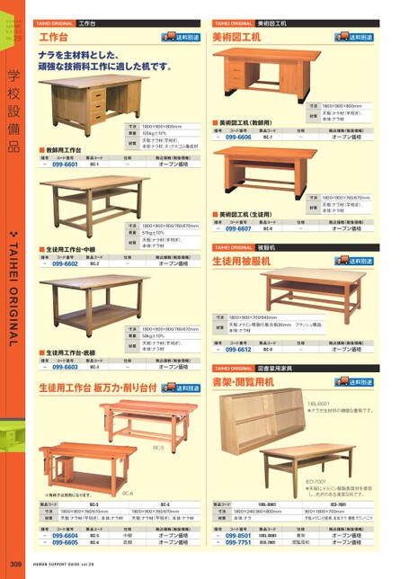 HUMANSUPPORTGUIDEvol.29HUMANSUPPORTGUIDEVOL.29TAIHEIORIGINAL工作台工作台TAIHEIORIGINAL美術図工机送料別途美術図工机送料別途ナラを主材料とした、頑強な技術科工作に適した机です。寸法質量材質1800×900×800mm105kg±10%天板:ナラ材(芋矧ぎ)、本体:ナラ材、ボックス:ゴム集成材■美術図工机(教師用)備考-コード番号099-6606製品コードBC-7製品コードBC-1仕様-税込価格(税抜価格)オープン価格■教師用工作台備考-コード番号099-6601寸法質量材質1800×900×800/760/670mm57kg±10%天板:ナラ材(芋矧ぎ)、本体:ナラ材仕様-税込価格(税抜価格)オープン価格■美術図工机(生徒用)備考-コード番号099-6607製品コードBC-8TAIHEIORIGINAL被服机生徒用被服机■生徒用工作台・中棚備考-コード番号099-6602製品コードBC-2寸法材質1800×900×800mm天板:ナラ材(芋矧ぎ)、本体:ナラ材仕様-税込価格(税抜価格)オープン価格寸法材質1800×900×760/670mm天板:ナラ材(芋矧ぎ)、本体:ナラ材仕様-税込価格(税抜価格)オープン価格送料別途■生徒用工作台・底棚備考-コード番号099-6603製品コードBC-3寸法質量材質1800×900×800/760/670mm58kg±10%天板:ナラ材(芋矧ぎ)、本体:ナラ材仕様-税込価格(税抜価格)オープン価格生徒用工作台板万力・削り台付送料別途寸法材質1800×900×700/640mm天板:メラミン樹脂化粧合板30mmフラッシュ構造、本体:ナラ材備考-コード番号099-6612製品コードBC-9仕様-税込価格(税抜価格)オープン価格TAIHEIORIGINAL図書室用家具書架・閲覧用机送料別途1IBL-B001●ナラが主材料の頑強な書架です。BC-5※角椅子は別売になります。製品コードBC-5BC-6BC-6寸法材質1800×900×760/670mm天板:ナラ材(芋矧ぎ)、本体:ナラ材1800×900×760/670mm天板:ナラ材(芋矧ぎ)、本体:ナラ材製品コード1IBL-B001寸法材質1800×240/360×800mm本体:ナラIED-7001●天板にメラミン樹脂表面材を使用し、光沢のある清潔な机です。IED-7001900×1800×700mm天板:メラミン化粧板、本体:ナラ、棚板:ラワンベニヤ備考コード番号製品コード--099-6604099-6605BC-5BC-6仕様中棚底棚税込価格(税抜価格)オープン価格オープン価格備考コード番号--099-8501099-7751製品コード1IBL-B001IED-7001仕様書架閲覧用机税込価格(税抜価格)オープン価格オープン価格学校設備品TAIHEIORIGINAL309